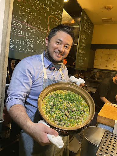〆のご飯はとうもろこしたっぷりの羽釜ご飯。ぽっちゃりした岡田准一くん似のとだか氏の笑顔が眩しい(笑