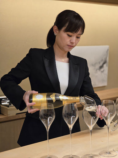 I had a very satisfying experience during my visit to Shuji, Tokyo. For the sushi review, I'll come back and talk about wine handling today. The basic but most important part is the handling of the crystal, which started off perfectly with the temperature of the champagne, the clean glass, and the temperature of the glass. I've only seen three Michelin stars like foaming, which reduces drops so that bubbles don't fly away quickly. Ayako Sommelier from Ekuatur (Taverog Gold), who was once the No. 1 Frenchman in the country for a long time, handled it perfectly, and she is Shuji's wife.
