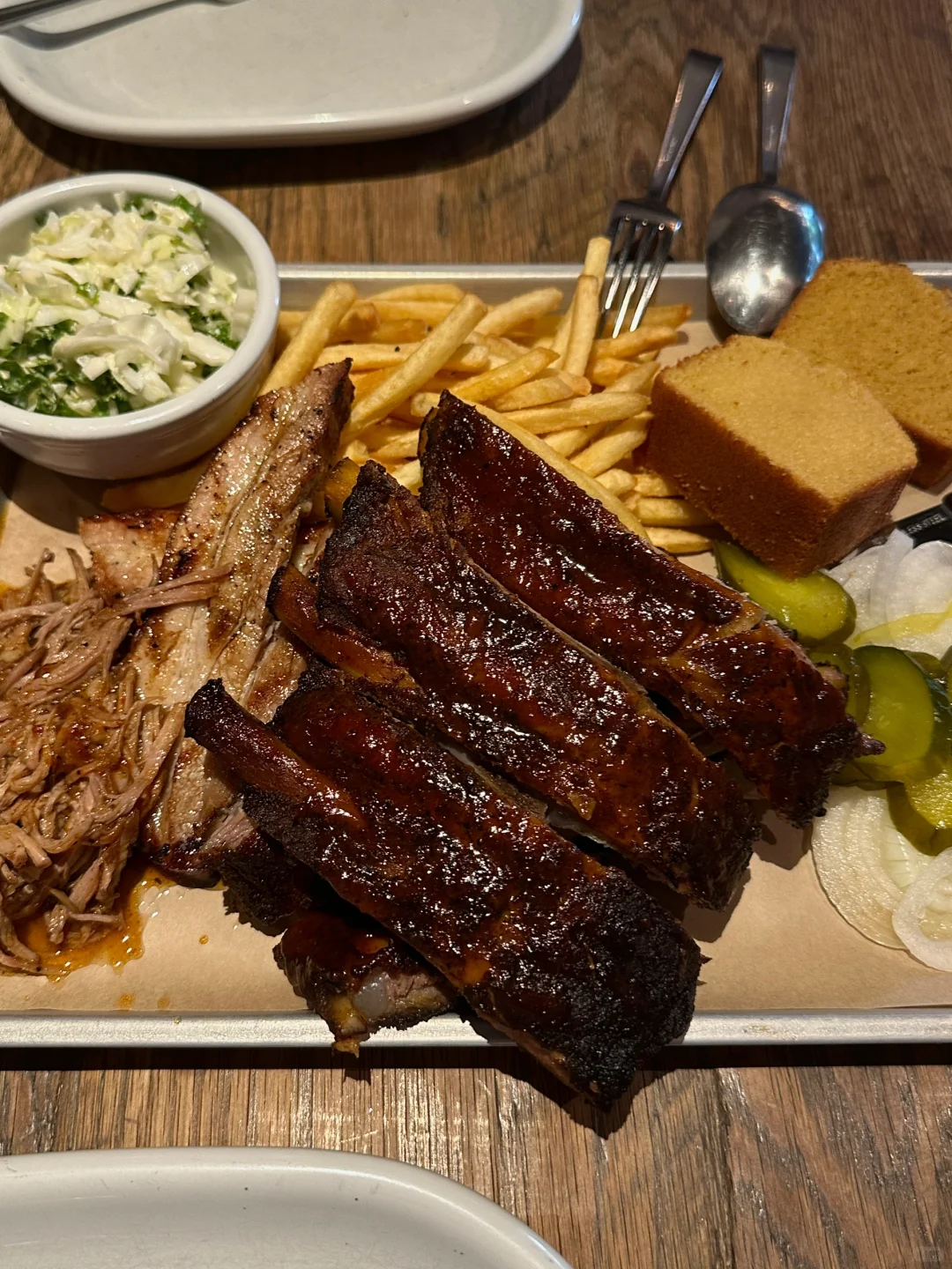 Everything was absolutely delicious 🤤 The pulled pork and chicken thigh were juicy and tender and just hit the spottt😮💨 The coleslaw didn’t taste too strongly of mayonnaise, which I liked. The cornbread was nice and crumbly, and although it wasn’t the best I’ve ever had, still great. Some parts of the meat from the ribs just fell off the bone😍🤤, while some parts were a bit more tough. Delicious nevertheless!