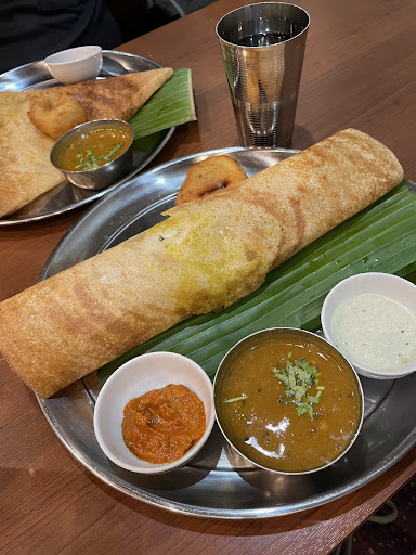 Read more南インド料理!北インド料理とはちょっと趣きが違うお味。 南には田んぼがあるのでお米文化圏です。 名物のドーサはインド風米粉と豆粉のクレープ。 マッシュしたジャガイモなどサモサ風の中身がもっちり米粉クレープに巻かれたマサラドーサがおいしい! ドーサを切って、ココナッツチャツネと辛めのチャツネとバナナの葉(現地で食べているみたいで嬉しい)の上で混ぜ混ぜして食べます。 基本、カレーやライタ(ヨーグルト)、チャツネはビピンバのように混ぜて食べるので、たくさん混ぜ混ぜしてください。 そして手で食べたくなる...!本来インドのカレーは江戸前寿司と同じでまず指で味わう系です。 指の腹でバナナの葉のスムースさをほっこりしながら混ぜたカレーを指で味わう。そしてお口へ。それが美味しい。けどここは日本だし...スプーンで混ぜていただきました。でも食べづらくてちょい指も使ったです。 連れ君が食べたチーズドーサもガレットみたいで美味しかったです。 メニューにある南インドの海の恵みのフィッシュカレーも珍しいです。 ケララ州のアレッピーの地名がついたカレーがありました。 南インドに行かれた方はアレッピーで椰子の茂る美しい海岸水路をボートクルージングした方も多いでしょう。 豊かな海の幸のお魚カレーかな? 次回食べよう。