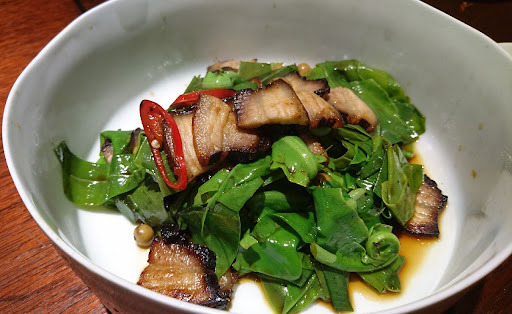【オオタニワタリと自家製ベーコンの炒め物】 自家製ベーコンの風味がよく、オオタニワタリとよく合います。