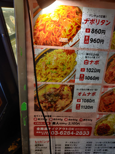 メニューに載ってない注文カスタマイズ。自分の知ってるやつだけ書いてみます。 小盛り200g、並盛り400g、大盛600gですが、「300」と「500」で、小から並、並から大の中間の量を頼めます。 「よく焼き」で、通常より長く炒めたやつが食べられます。自分は東海地方出身で、ナポリタンじゃなく、イタリアンの方が慣れ親しんだ味なんですが、このよく焼きがイタリアンの味に近くて好きです。 「ベーコンカット」でベーコンをカットして出してくれます。でかい厚切りベーコンはインパクト大なんですが、フォーク一つじゃいかんせん食べにくい。かぶりつく醍醐味より食べやすさ優先なら、カットしてもらった方がいいです。 ただし、メニュー外の注文ですので、出来ないって言われても文句は言わないように。特に、よく焼きは普通より調理に時間がかかるので、超混雑時だと迷惑かも。