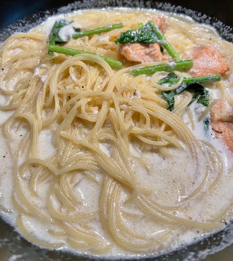I ordered salmon and spinach spaghetti in cream sauce and some karaage. The amount of pasta that came with the large size made up for the bland taste of the watery cream sauce. Spinach was mostly stems and not much of it. Small amount of salmon was in messy chunks but cooked nicely. Spaghetti was al dente.