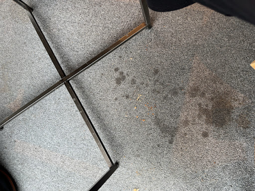 清掃をすぐにしないと珈琲等でしょうし零されると染みになります。恐らく通常の定期清掃しかしておらず、タイルカーペットを染みの酷いところだけ交換するということもなさそうで 店内中染みだらけで汚らしい印象です。 食べこぼしがテーブルや床にたくさんあるのでそれも気になります。 清掃が間に合わないならカーペット敷きではない方が染みにもなりにくく、不潔にならず良い気がします。
