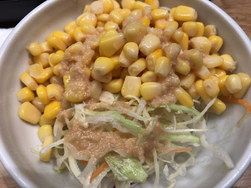 こじんまりとしたサラダバー。千切りキャベツ、コーン、ポテトサラダがあって、いわゆる松屋のサラダを自分で作ります。ドレッシングも各種揃ってる。スープは普通のわかめスープ。