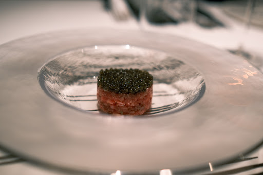 ・黒毛和牛タルタル〜キャビア添え〜 極上の赤身肉を丁寧に刻み、シルキーな口どけに整えたタルタル。上に添えられたキャビアの塩気が、肉の甘みを一層引き立ててくれる。