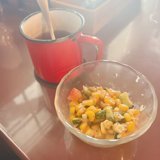 セットはデフォルトで、 ・ちょうど良いサイズのライス ・鉄板の上にはコーン ・ミニメキシカンサラダ(コーンときゅうりとトマトを胡椒の効いたコブドレッシングで和えたもの) ・コーヒー がついてきます。