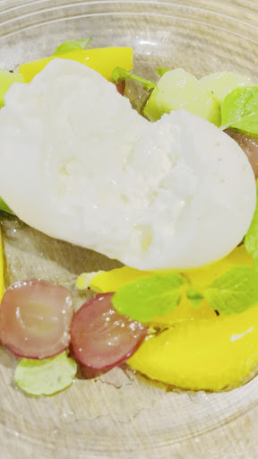 他注文したのは ♦︎季節フルーツのプラッター 1870円 柔らかでとろとろのプラッターヂーズ 柿山 巨峰、キウイ、オレンジのフルーツ添え チーズを割って果物と合わせ口に運びました。チーズの味と果物の甘さが相まって美味しく頂きました。フルーツヂーズの組み合わせ最高!