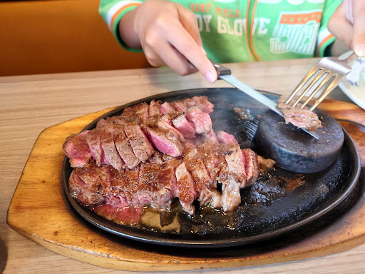 Read more孫と一緒にステーキを食べに行きました。 日曜日の11時30分ごろですから、入り口を入ると席が空くのを待っているお客様がいらっしゃいました。 私達も、受付簿に名前を書いて椅子に座って待っていると10分ぐらいで順番が回ってきて、席に着くことが出来ました。 メニューからボリュームのある、ステーキを孫が300g、私が150gのを頼みました。 ウエートレスさんが、席から離れると孫がサービスのスープを取りに行ってくれて、それを飲みながら待ちました。 暫くすると、ご飯とステーキを運んできてくれました。 孫の300gのステーキは、3段重ねでした。 私の150gのは、それに比べてとても少なく感じました。 このステーキは、焼き方は聞かないで持って来てくれたのはレアーでお皿に丸い熱くなった所があり、ミディアム、ウエルダンの希望者は、そこに運ばれたお肉を当てて自分で焼くことが出来るようでした。 私は、レアーが好きなので2種類用意してあるタレをつけて食べましたが、興味半分で一切れだけその熱いと事にお肉を当ててみるとジュ―と言って色が変わってきます。 「こうするんだ。」と思いながら、孫を見るとお肉と戦っている感じでドンドン食べています。 私は、年も取っているので小さく見えた150gが少し残すようでした。 孫は、300gを完食です。 ステーキ専門店ですので、とても美味しく食べる事が出来ました。食べながら孫と話したのですが、オニオンのタレとニンニクのタレの2種類でしたが、その2種類を混ぜて食べるととても美味しいと意見が合致しました。 とても、手軽な料金で楽し...