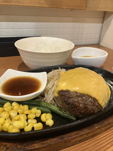 とある金曜の11時45分に到着するとすぐにカウンターへ💁♀️ステーキ各種や和牛鉄板焼肉も気になりますがハンバーグが好きなので和牛ハンバーグにチェダーチーズをトッピングでオーダー!その後12分程で到着🍚