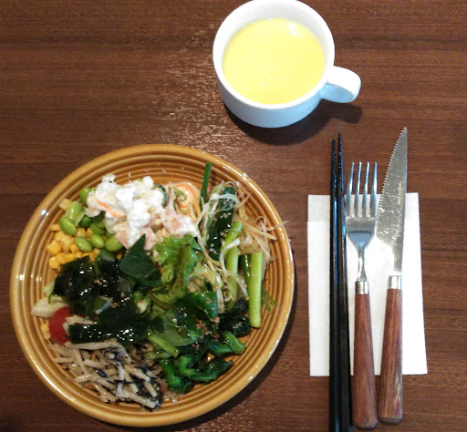 サラダは豆、コーン、プチトマト、千切りキャベツ、レタス、サニーレタスの他にほうれん草のシーザーサラダ、ネギとザーサイの中華風サラダ、春菊とキャベツの中華風サラダ、トマトとベーコンの冷製スパゲティなど種類豊富。 ビッグボーイといい勝負でしたがこちらは鮮度が良かったように感じました。 ただ、ブロッコリーはなかった。