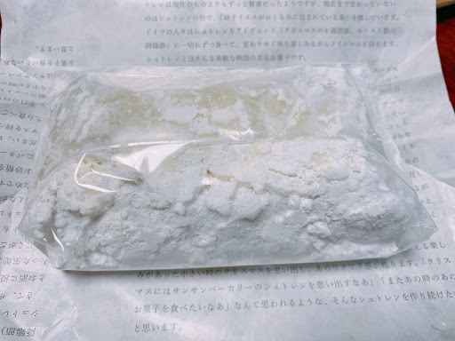 シュトレンは白いちじくのシュトレンでスパイスとお酒に浸したレーズン・カレンズ・アンズ・オレンジ&レモンピールがたっぷりと入った生地。