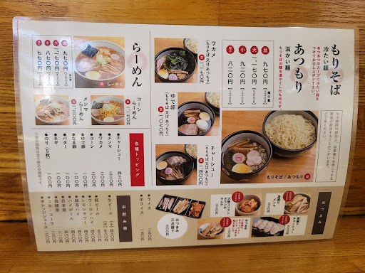 メニューを眺めて口頭注文。 ラーメンメニューも気になりますがやはりここは『もりそば』でしょう。 麺量は並盛りで330gと嬉しい盛り。 小盛230gや極小130gもあります。 麺量を少なくすれば値段も安くなる小食さんにも嬉しい設定です。