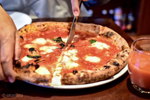 マルゲリータは生地が割と薄めで、縁の部分は膨らんではいても薄い生地が空気を含んで膨らんで、焦げ目がついているという感じ。ところどころ破裂して、その生地の厚さ加減が分かります。トッピングのトマトソースはフレッシュさと酸味を残した軽いソース。こちらのピザはとても美味しく、食べやすくライトで好みでした。