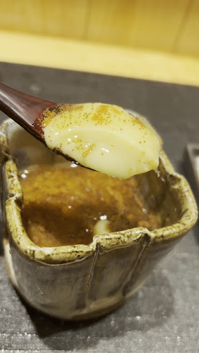 ♦︎香箱蟹の茶碗蒸し いよいよ香箱ガニの季節になったかと感激。 今年初めての香箱ガニをいただきました。 上には蟹の外子の餡、玉子の中には内子と身があっぷり入っていめ香箱蟹の旨味が味わる贅沢な茶碗蒸し