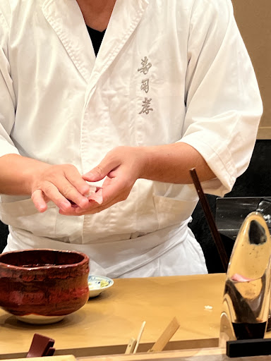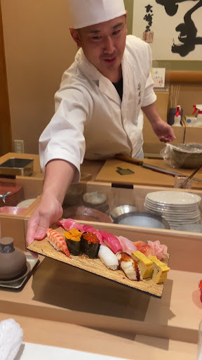 We had one of the best dinner experiences we’ve ever had! We showed up late on a Tuesday night after literally just landing in Tokyo for the first time. When we walked in the chef immediately welcomed us and pulled out a translator device to talk with us. He asked us what we would like and helped us decide on a set menu to start, and added that we could always get more if we were still hungry. He also asked if we had any allergies. I don’t remember what menu he recommended but it was perfect. He made each piece of sushi by hand and served it one at a time. If you appreciate visual presentation then you will be very impressed here- every item came on a gorgeous plate or dish, with beautiful fresh garnishes that also gave interesting flavors and textures. The chef conversed with us while he prepared the food right in front of us - it was like a show- and explained what type of fish each item was made with and how to eat it (I asked because I was unsure at some points.) The fish was SO fresh and delicious. I tried some things I’ve never tried before like grilled eel and salmon roe. Other things I had tried before, like tuna, were hands down the best I’d ever had. My favorite piece was mackerel and I also enjoyed the hand roll he made. The atmosphere of the restaurant was beautiful - cozy, warm, and calm. The staff were very attentive- constantly clearing the little dishes and asking if we needed refills on drinks. Don’t hesitate - just...