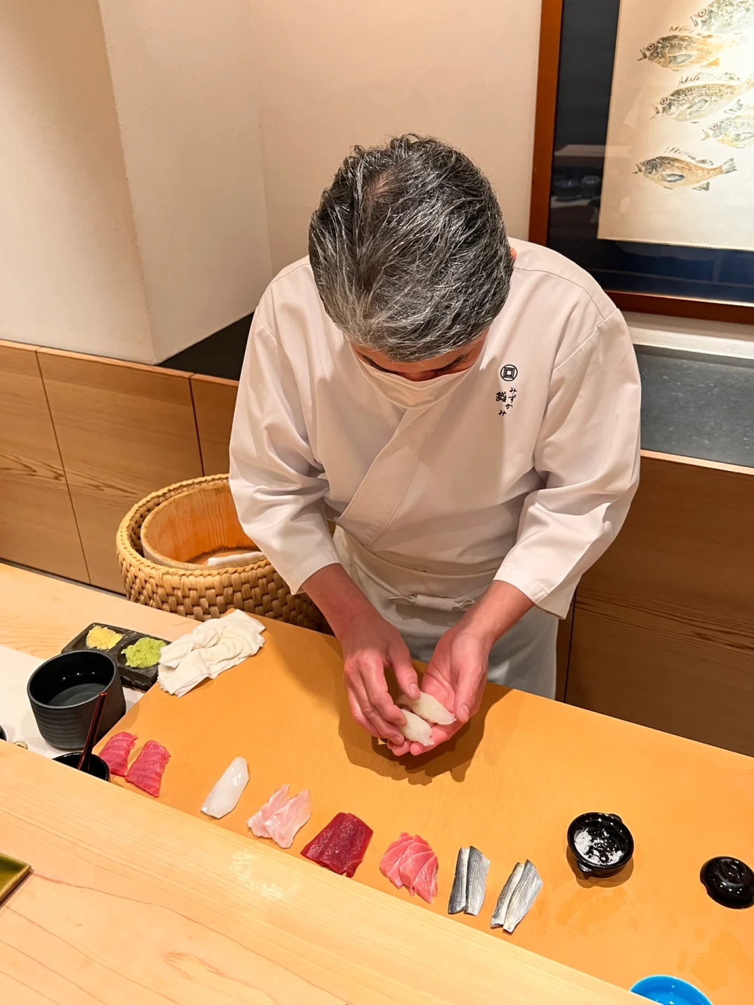 いつも参考にしているブロガー様のサイトを拝見すると、 親方の水上行宣さんは名店「 すきやばし次郎」で修業された職人で、 本店と六本木店で合計16年もの修行をされたそうです。 鮨職人としてのスタートは川崎市の鮨店で、 そちらでも7年間修行されていたので合計23年もの修行期間だそうです( ゚д゚)