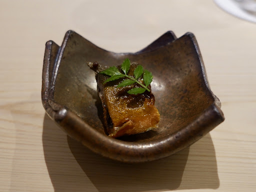「あん肝」…血の臭みを感じさせないように砂糖、醤油で甘辛に炊いて防ぐが、こちら西崎さんは血抜きをしっかりしているので、醤油をほとんど使うこともなく、甘辛くする必要もなくそのままいただく。以前もこれが出て一番印象に残っている一品…自然の甘さととろける柔らかな食感がたまらない。お酒も進む。