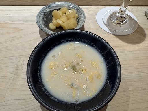 ビールで乾杯ののち、数品のツマミ的な料理からスタート。 外も寒くなってきたので、まずは温かな「豆乳と鰹出汁、シラウオ」から…出汁がなんとも美味シィ・創作料理広尾。、シラウオは旨い食感アクセントになっている。初っ端からやられた感じ。