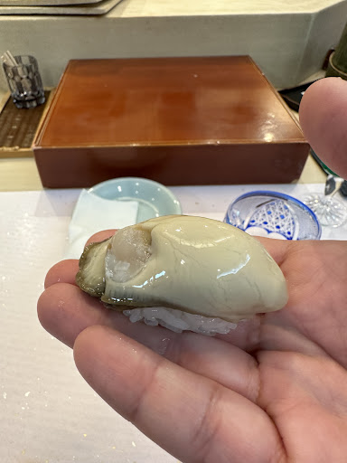 I liked the fact he served the shrimp head along w the shrimp. Anago was served two ways (salt and sauce). Shima aji and Akashi were also good. Uni and abalone were directly served to my hand. Abalone was really tender. Then tuna three ways. He marinated them in some kind of soy sauce for about 15 mins. Last piece was torched and served upside down w rice. All three pieces were tasty. The sides of red clam were used for the hand roll. I ordered two extra pieces - oyster and aji and both were fresh. I could taste the ocean when I had the oyster sushi.