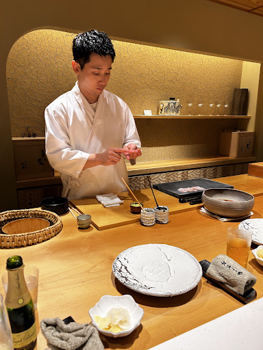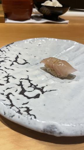 Read moreFor our generation in Nishi-Azabu, the first thing we did was walk into the basement of the brand new Barbier Building, just to the right of Gaien-Nishi Dori toward Hiroo at Kasumicho intersection. We were seated at the counter, a little tightly packed for about 11 people. I was immediately asked what I wanted to drink, and I ordered sparkling wine, which was brought out in a perfect small bottle. Other people also ordered whiskey soda, sake, tea, etc. Apparently they're closed on Sundays and Mondays. The first white fish was a Kue nigiri, and the rice was nicely warm, small, and elegantly flavored. I ate it without even taking a photo. Then, a small bowl of shredded yam and okra with vinegar turned out to be a dashi broth. Then came seasonal pacific saury nigiri, which is really fat this year. Before the bigfin reef squid nigiri and crab with a yuzu sauce, I had a golden-eyed snapper nigiri, which I immediately ate and forgot to take a photo. It was delicious, and we had pickled tuna, fatty tuna nigiri, grilled Spanish mackerel with Nishikyo-style seasoning and simmered eggplant, a soup with dashi broth, grilled horse mackerel with bok choy, then a slightly earlier salmon roe and sea urchin, followed by deep-fried lion peppers with shirasu and matsutake mushroom tempura, small spring rolls, my favorite thick conger eel nigiri, then a refreshing hand-rolled cucumber and dried gourd, a purple miso soup, and a dessert that was probably sake lees pudding. We were full, it was delicious. The chef was young and cool, and this sushi restaurant will undoubtedly become popular with...