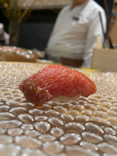 ・トロ 鬼のように飾り包丁が入ったトロ。その数なんと50本。どうやってこの面積に50本も入れ込んでいるのか。まさに匠の技。 口の中全体に拡散するかのようにトロの甘さが支配してくる。 これは冗談抜きで今までのトロでダントツ。 多分飾り入れすぎて醤油が中まで浸透しているのか、漬けみたいな濃縮感もあり、最高のバランスで整えられた一貫だ。