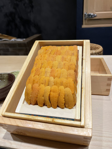 ・バフンウニ 北海道産のバフンウニ。 四角い雲丹がシャリの倍程までツンデツンデされた3Dバフンウニ。 文字通り口一杯に雲丹で満たされてしまい、もうなんか味わうとかじゃなくてシンプルに幸せ。最&幸。 甘さと潮っ気がちょうど良くて、ライトな口当たりと旨味をしっかりと感じる。 めちゃくちゃ美味しい。