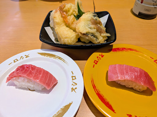 今日の満足度は以下の通り ◎:北海道産いわし天ぷらにぎり ※さくさくして美味しい。 ◯:寒ぶり、サーモンちーず △:天然まぐろ上赤身、漬けまぐろ ※間違えて同じものを出したのではと 疑いたくなる程、同じ味でした…。 ✕:こく旨まぐろ醤油ラーメン ※非常にしょっぱくて美味しくない。