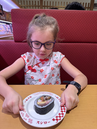 So… if you are expecting a conveyor belt sushi as experienced elsewhere in the world - this place has a conveyor belt where you can get sushi delivered, AFTER you place an order. When we arrived, we had to print a number and sit on the queue (large waiting room). 20min waiting time was ok… however! The food quality! It just shot me down! This is my second visit in Japan. My first was almost 10 years ago. This time around the whole food quality has dropped drastically compared to before. Even high-end Japanese restaurants have started serving mediocre food. Back to Sushiro- the food was SO bad that I had to call staff and ask for refunding me one of the plates with fish as the fish was absolutely inedible and I was unable even to bite through it - like a dead muscle with skin on… they apologized and said they will cancel this particular plate. The beef tongue sushi was also ultra difficult to chew. I just scrolled through the menu and saw sushi with BUTTER on the top?! In which world?! And I thought the Westernized Philadelphia cheese in sushi was odd… but butter is fine :) For an adult and a child we paid ¥3000, including a crême brulée which tasted as coming fresh from the convenience store. Service was ok, I got a DEEP bow upon paying my bill by one of the sushi chefs as an apology for...