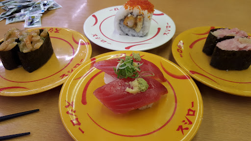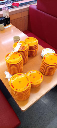 Read moreLove it, but it just isn't as good as my favorite "100 yen" sushi place. Smaller portions. Higher prices (120-180 yen for basic options). Today, lackluster service and atmosphere - the hot water taps were not working, all the soy sauce bottles on our table were nearly empty, and one of our ordered items came on the wrong delivery tray (orders are color coded).