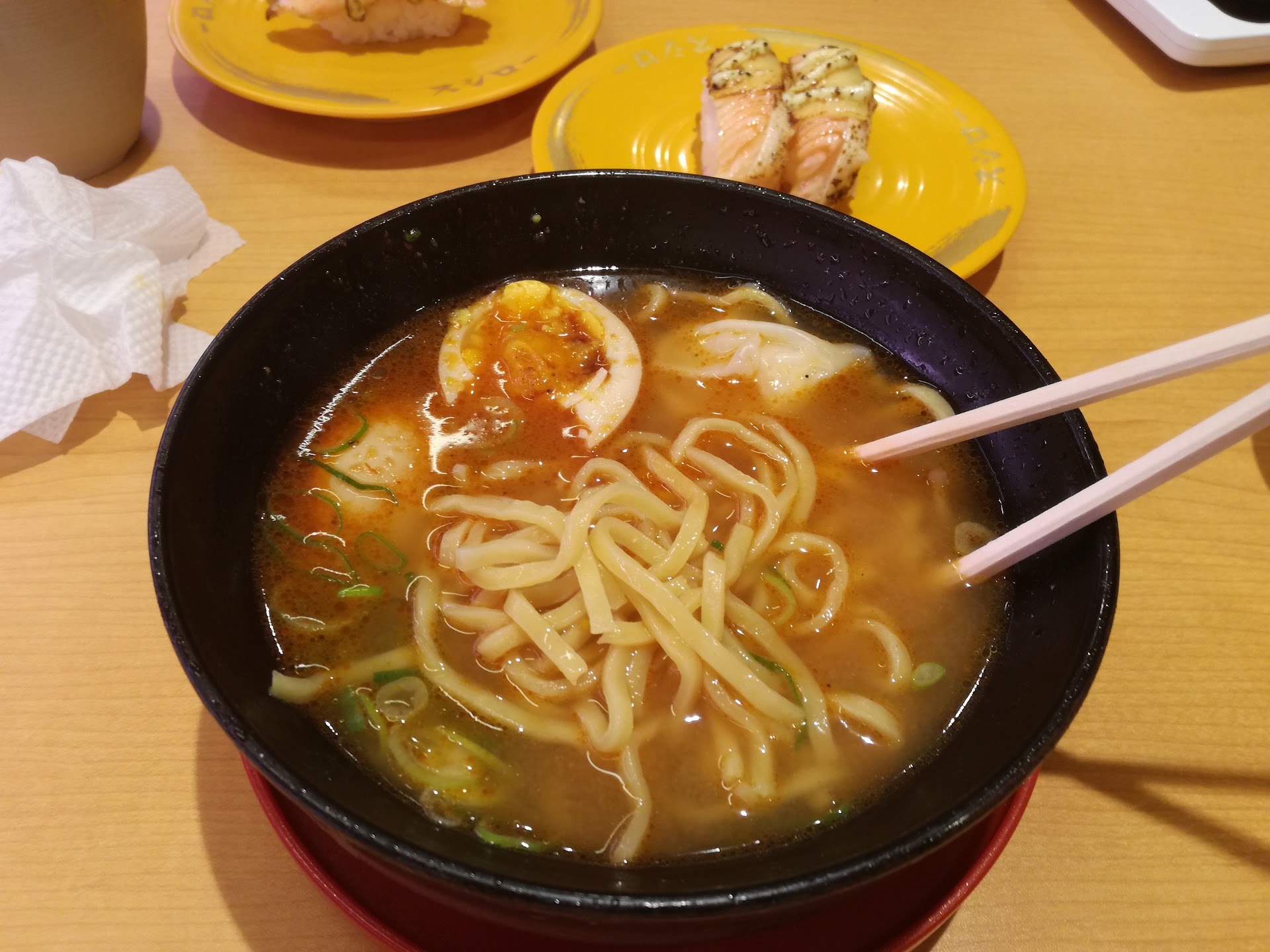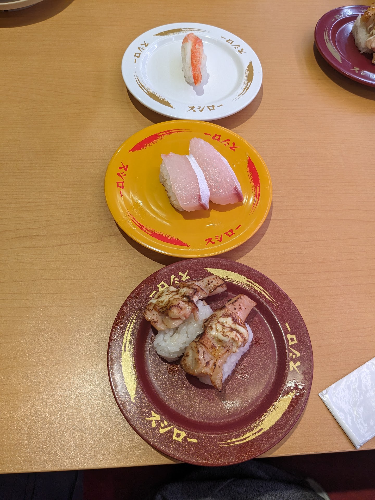 Sushiro is well worth the wait. You enter through a door on the first floor outside and then proceed down 1 set of stairs. To get a seat, you walk over to the machine and select where one the restaurant you’d like to sit: you can sit in a booth and use the conveyor, or sit in front of the sushi chefs and watch them prepare it. Once you’ve been called back (you can watch the tv screens for your number on your ticket), you then can select your language on the tablet at the table. The current languages available are Japanese, English, Korean, and if I recall correctly both Mandarin and Cantonese. Once you select your language, you can easily select which item you would like and place your order to arrive on the conveyor belt up top. You can also grab anything on the lower belt. If you have separate tickets, just keep your plates stacked separately. When the bill comes, they will wave a device over the plates to see how much to charge you. Each plate price is color-coordinated and had a chip on the underside for the device to catch the cost. After the waiter/waitress gives you your receipt, you go up front and insert the ticket to pay and either pay in yen, or with a Suica/Pasmo card, OR you can swipe your CC to pay. That’s it! Enjoy Sushiro and come back again soon! It’s delicious and well worth it! I recommend the shrimp and salmon with cheese and the salmon with basil...