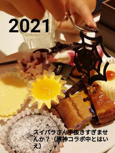 Read more更新★2021年のハロウィンスイーツレポ→はただのケーキ多数。映えなすぎて写真一枚だけでアップ。 過去画像見ればわかるけど前は目玉入りゼリーやロールケーキのキャラデコ、コウモリやら蜘蛛の巣やらあちこちにハロウィーン要素があったが今回はホントただのケーキ。ホムペにあったいま時期のケーキで大好きなミルクレープすらなかった。