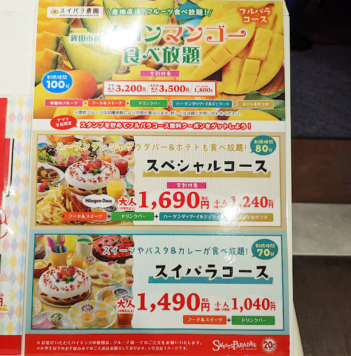 Read more2023/5/17 「スイーツパラダイス 町田モディ店」にて、5/17からのフルパラコース「鉾田市産メロン&マンゴー食べ放題」100分 平日3,200円/土日祝3,500円 鉾田市の契約農家が生産する青肉メロン「キスミーメロン」と赤肉メロン「ラブミーメロン」、タイ産マンゴー・メキシコ産アップルマンゴー・台湾パイナップル「金鑚パイン」・5月末まで鉾田市産いちご「すいぱらひめ」食べ放題+30種類以上のスイーツやフード食べ放題+ドリンクバー+ハーゲンダッツ・イルジェラート食べ放題+サラダバー+フライドポテト食べ放題の構成。 ファーストプレートは少量のフライドポテトのみで、フルーツは最初から自由に取りに行き、ナイフ&フォークでカットして食べるスタイル。 食べ放題のフルーツの中では当然ながらメロンを集中的に確保。 当日の青肉メロンは「キスミーメロン」ではなく同系統の「アールスメロン」だったが、果汁したたるジューシーな果肉と上品な甘さを堪能。 赤肉メロン「ラブミーメロン」は、糖度18度以上と甘みが強いが、「アールスメロン」よりも果肉は固めで赤肉ならではのクセがあり、個人的には青肉メロンを集中的に攻めるのがオススメ。 マンゴー2種はいずれも状態が良く、豊かな香りと濃厚な甘みを愉しめる。 「すいぱらひめ」は、2月の食べ放題のときよりも一回り大きなサイズで、果肉はやや固く甘さよりも酸味が勝っており、メロンやマンゴーの合間につまむ程度の量で抑えた方が良い感じ。 今回はケーキ等の加工品は一切取らず、フルーツ一点突破でメロン2玉相当を完食して大満足。 お会計は 町田モディ内店舗ということで、クレジットカード(VISAタッチ可)・EPOS...