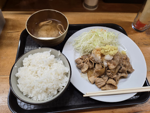 お店に入り、ちょっと古びた券売機(苦笑)に、お金を入れて580円の「醤油だれ生姜焼き定食」を注文しまいました。他にも味噌だれとか、数種類の「生姜焼き定食」があったのですが、、、ここはスタンダードに定番の「生姜焼き定食」を。