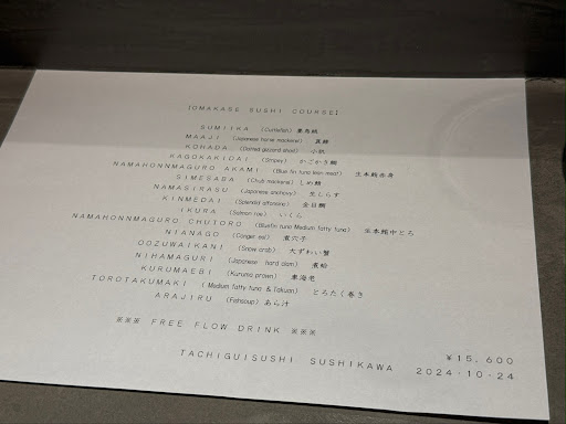 The ambiance is minimalist yet inviting, with a stylish white and wood interior that elevates the standing sushi bar concept. I saw that all foreigners are given the 15-piece course, inclusive of an all-you-can-drink alcohol package (Bottle Beer / Japanese Sake / Wine / Champagne).