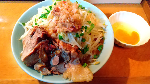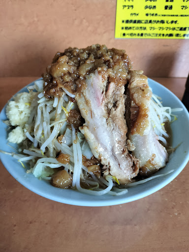 Read more会社の研修所が多摩にあって、研修中は立川マシマシには結構行っていたんだけど、割と近場にあるんだと知って、マシライスではなく、インスパイアを食べに行ってみた。 サイズは中、野菜をちょいマシにしてみた。 サイズ感は、本家二郎(中山)に比べて、麺はちょっと多い。野菜はマシと同じくらいかな? 決定的に違うのは、甘めのスープ。甘い。チャーシューのタレを連想する甘さ。カミさんに遠慮してニンニクを遠慮したからか、カネシ醤油の辛みも無いし、甘くてキレがない。 がしかし、麺は他店で平打ちと称されるものと違って、ぎょうてん屋の「ぎ郎」を彷彿とさせる丸目の極太ワシワシ麺!!これは、気に入った!! 野菜、ホロホロ豚、ワシワシ麺・・・もう、二郎ですよw 醤油のキレがあれば・・・もっと旨かったかな・・・なんて思ったけど、十分に美味しかったw ぺろりと行けちゃったので、サイズは中、野菜マシ、アブラちょいマシ、これがターゲットになるかも。 バイクも気軽に停められるし、産まれた町に近いのもあって、要チェックな店になったw 【追記:2022.04.16】 気になって仕方ないので、今週も開店待ち1番(PP)で行ってみた(笑) 何が気になって仕方なかったのかと言うと「中ヤサイ・マシ」が食べきれるのか…ということ。前回はちょいマシであったが、年甲斐もなく「ちょい」というのはズルしているようでスッキリしない…w そんな葛藤を抱えつつ、一番手でコールする。「ヤサイ・ちょいマシ、アブラ・ちょいマシ」ま、負けた…。 敗北感満載の私に帰ってきた店員(女の子)の言葉は「マシですか?」(笑) だ~か~ら~「ちょい」って言ってるじゃん!!恥ずかしいのに!! もう一度、同じコールをするも(女の子)「マシじゃないんですか?」…。 「ちょいマシで、お願いします!!」と、大きな声で3回目を言うも、すでに運び始められた丼…。そして着丼(笑) 右隣の2番手の初老のオッサンが頼んだ「中のヤサイ・マシ」よりも、見た目多いでしょ(笑)という「コールは中ちょいマシ」が私の目の前に…。 奇しくも、内心で攻略したがっていた「中のヤサイ・マシ」が目の前に来ることになって、これも運命、と思い食べ進めることに。 ヤサイの湯で加減は絶妙。ニンニクを追加したスープを上から掛けまわして香りも良く、味付きアブラも旨いwwチャーシューも程よく赤身肉が残っておりホロホロ。不思議とチャーシューの脂臭さを感じないのは、甘辛の味付けからなのか…。追チャーシューのトッピングか、アブラ・マシマシを考えてしまう絶妙のハーモニー。 ようやく麺が登場すると、一気に華やかさが増すww小麦の香りと歯ごたえ、喉越し滑らかなバランス良し!!の極太麺。このバランスが好きで、胃袋量を鑑みて「小ヤサイ・マシ」「中ヤサイ・ちょいマシ」を悩んだのに、目の前には「中ヤサイ・マシ」ww 両方味わえる幸運に、食べ切る使命感が芽生えるw そんな使命感をよそに、美味しさで箸が進む進む、ワシワシ、ムシャムシャ…w 無事に完食!!美味しい…美味しい…旨いぞ!ロイヤルスープ!! ラーメン二郎で評価の高い中山店の近くに住んでいながら、立川マシマシ・ロイヤルスープの魅力に完全にやられてしまいました…。旨いです。美...
