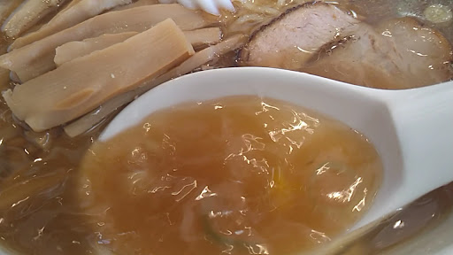 Ha ha, used to live around the corner from this place, very unique ramen with fish-based (nishin/herring, I think) broth, HUGE portions, about 3-4mm of scalding hot oil sits on the top of the soup keeping the whole bowl & noodles piping hot for your entire meal, be careful. Noodles cooked and served to perfection, definitely an acquired taste, but becomes addictive due to its uniqueness and balance between flavors, including some subtle but important bits of yuzu skin. All business inside, ramen, freezing cold glasses of water, maybe nama tamago, menma or extra chashu - otherwise, no chatting, no gyoza or beer at this place. Can't wait to go back....
