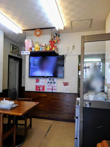 稲城大勝軒の白いのぼり、お店は6席テーブル×2、L字カウンターに8席ほど。シンプルなつくりですが、きれいにされています φ(・・