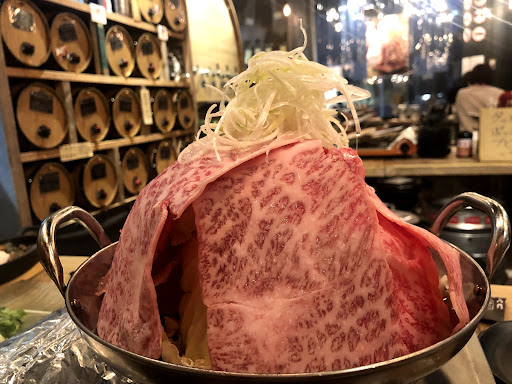 ■超名物!霜降り和牛鍋 2,280円/人 大きなスライスの見事なA5霜降り肉の山です。 甘いキャベツと白菜。豆腐も美味しい。 下にはぷるぷるのホルモンも入った塩ホルモン鍋系のとっても美味しい鍋です!