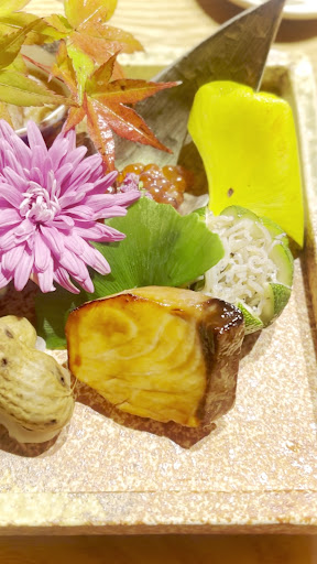 ◇焼き八寸 ・秋鮭のすじこの紹興酒漬け ・北海道知床のブリの幽庵焼き ・千葉県 生の落花生『おおまさり』の塩茹で ・蓮根の甘酢漬け ・じゃこと万願寺とうがらしの和え物 ・魚のなめろう ・胡桃と無花果の胡麻和え