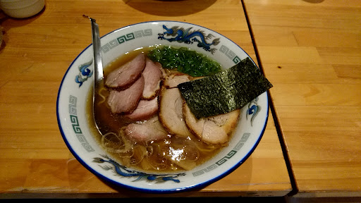 ○8丁目ソバ990円(チャーシュー3枚、ワンタン3個、味玉、海苔3枚) ワンタンは餡がぎゅっと詰まった肉肉しくて旨い! メンマ香りよし、葱、海苔、味玉、チャーシューは旨い。 スープはさらりと和風出汁、塩と醤油の間?淡麗ながら動物・魚介のフレーバーが口の中に広がる。 卓上の揚げネギを追加すると最後まで飽きのこないシンプルな味を楽しめる。