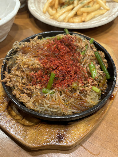 ⚪︎鉄板汁なし麻婆春雨 居酒屋で麻婆春雨ってあんま見ないなと思って 頼んでみましたがかなり好きでした。 結構本格的な辛さで春雨に味がよく染みている のでお酒が進みました。 ひき肉たっぷりなのもよかったです!