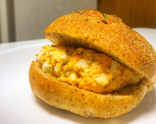 パンの表面にチーズが香ばしく焼かれており、独特な見た目。チーズ風味がする独特なパンにブラックペッパーが効いており、マヨネーズと和えた卵は超旨い。特におすすめ🍳