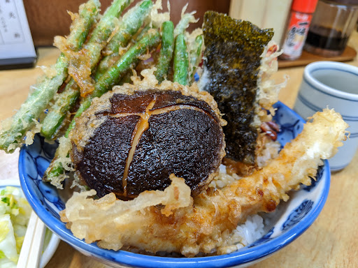 Small but cozy place. Had tendon (850 yen) for lunch and it was great - large portion, freshly fried veggies and seafoods. If you don't want the fried things on top of rice, you would want to order teishoku (850 yen) instead that separates the fried...