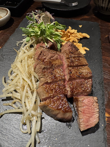 I can’t recommend this place enough. My husband and I went here for our anniversary and everything was amazing; from the service, to the atmosphere, to the FOOD. Oh my gosh is the food divine. When we arrived (it can be tricky to find but it is to the right of Uohama on Imorai Zaka street down the first set of stairs on the side of the building, where you then take an elevator up to the sixth floor and step straight into the restaurant.) We were greeted immediately, and I don’t believe this happens every time, but we were able to pick our seats (even though we had reservations, which are highly recommended as the seating is limited) and chose the private room. We had the wagyu special and it came with a four course meal where we got to pick the Wagyu cut we wanted. The waitress was so kind and helped us know what menu options came with what (as they have course options as well as options of a la cart items). The food came very well seasoned, cooked, and prompt, with low wait times for each course; but not rushed to where we were stacking up on items. Everything was timed appropriately. We ended up having the restaurant to ourselves so I am not sure if any of this would be different during peak, but I would doubt it because of the professionalism and craft each person brings to this exquisite restaurant. We then were given our dessert and they dressed up our plate to my husband’s wishes, writing a sweet message out of chocolate on the plate. They were also very careful about his dairy allergy throughout, and put in substitutes when something couldn’t be served without dairy (this only happened once with this delicious cold cream broth that I had for one of my appetizers, which they switched for duck confit, also delicious.) Again, everything was cooked amazingly and we got to see the cuts of meat before they were cooked to make sure it was to our liking. They even brought us out to see the chef flambé them as you can see them cooking from the front of house. It was definitely on the pricier side but so, so worth it and I would definitely come here again for future special...