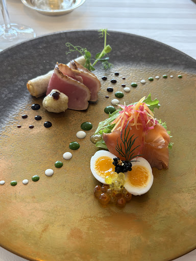 ★自家製スモークサーモンのサラダ キャビア添え 鴨胸肉のスモーク 栗のクレープと共に お友達はあっという間に完食☆:.。. o(≧▽≦)o .。.:☆