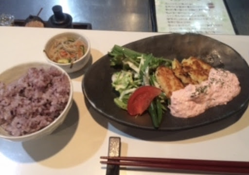 Read more中野駅南口からすぐの場所にあります。 てしおご飯 玄 中野店です。 おしゃれな創作居酒屋さんが昼にランチをやっているって感じ。 私が伺ったのは昼の12時ごろ。 まだお客さんは居なかったので、おそらく1番手! カウンターに通されてメニューを見ていたら次から次へと、一人の女性から男性まで来るわ来るわ!!あっという間に隣まで埋まってしまいました。 私は『メカジキのパン粉上げタルタルソース定食』を注文! ご飯を雑穀にしてもらい期待を膨らませる。 タルタルがピンク色に染まって色鮮やかだ! サラダと小鉢、味噌汁がついて920円かな。 混んできてちょっと駆け足で食べてしまったが、かなりの優良店!中野のランチ上位に食い込むだけあります!夜も伺ってみたいなと思う店でした。