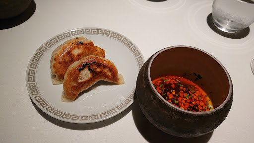 よだれ鶏を三段活用: こちらの三段活用は笑えました。一段目、鶏を浸しているタレ汁ですが様々な味がしますが特筆すべき味ではない。鶏に関してはボイルした鶏のスライス。鶏自体に汁が染みている訳でもなく物足りない。2段目、驚いたことにその残ったタレ汁に焼き餃子を付けて食する。高級を売りにしている店舗で残ったタレ汁で焼き餃子とは…悲しくなります。3段目、山椒に練り込んだ麺を更に残った汁で食する。このタイミングで麺出てきた!と首をかしげる。最後に更に残ったタレ汁に豆乳を投入し合わせて飲むという、なんだか気持ち悪い。百歩譲って各食材からだしが出て回を重ねるごとに深味を増すとかだったら分かりますよ。しかし前の食材からダシなど出ません。残り汁を上手いことやったみたいに演出しているだけとしか思えません。仮にそこまでこのタレ汁を推すのであればその都度、新しいタレ汁を提供するほうがスマートで気持ち良いです。