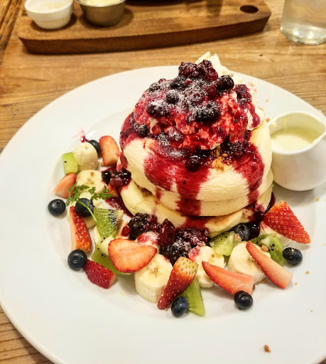 Come here with an empty belly but expect a wait. This is a popular spot apparently. Featuring American style dinner food with a Japanese twist on a lot of it. I believe they have specials that change regularly and new interesting items replacing other ones often. After failing to get Puffy pancakes from a recommended place in Asakusa earlier in the day, my friend and I found this place after exploring some of the arcades and geek shops in Akihabara. Thank fully unlike the place I was recommended to, this place does not require reservations and can make puffy pancakes any time with no limits. I ordered this which I think was a seasonal special of fresh fruit pancakes with white chocolate sauce and I also had a big pot of exceptional earl grey tea. You get 3 pancakes and a ton of toppings as you can see. It was delicious and the pancakes were so filling I almost couldn't finish them. Be prepared for a possible sugar coma after especially if you use all the chocolate sauce. The line was long but moved fairly quickly and the pancakes took a little while to come out but this should be expected as they're made fresh to order and the presentation was lovely. All wait staff speak very good english and are very attentive, getting us what ever we needed. Highly recommend checking it out for your puffy breakfast experience lol.
