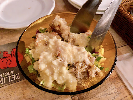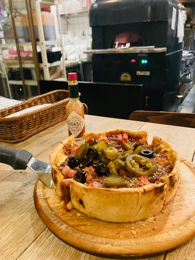 First of all I have to be a bit more strict with my review because the prices are really on the premium side. For the rustic warm atmosphere, it was good.. The rooftop outdoor part looks very appealing but probably for warmer days. The manner of the staff wasn’t super friendly.. A little cold. The starter they gave (the little shu puff thing with savory filling in the last photo)… It was a bit unnecessary.. Because the flavors plus using the shu puff shell didn’t work at all… It wasn’t tasty and the textures were annoying. However, since this restaurant seemed more about the deep Chicago style pizzas, I ignored the starter. Hmmm.. So I ordered the Hot Chicago.. I felt for price it wasn’t amazing. Almost 2000 yen for a small pizza. The crust was ok, but when I cut it there it was a bit watery.. The tomato sauce wasn’t great.. Felt like the bacon cubes they used were quite chunky and didn’t taste like real bacon.. Honestly.. I would come back for the rooftop and atmosphere but for the price it was a really average...